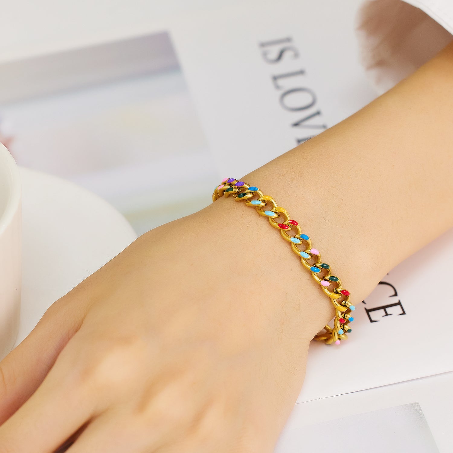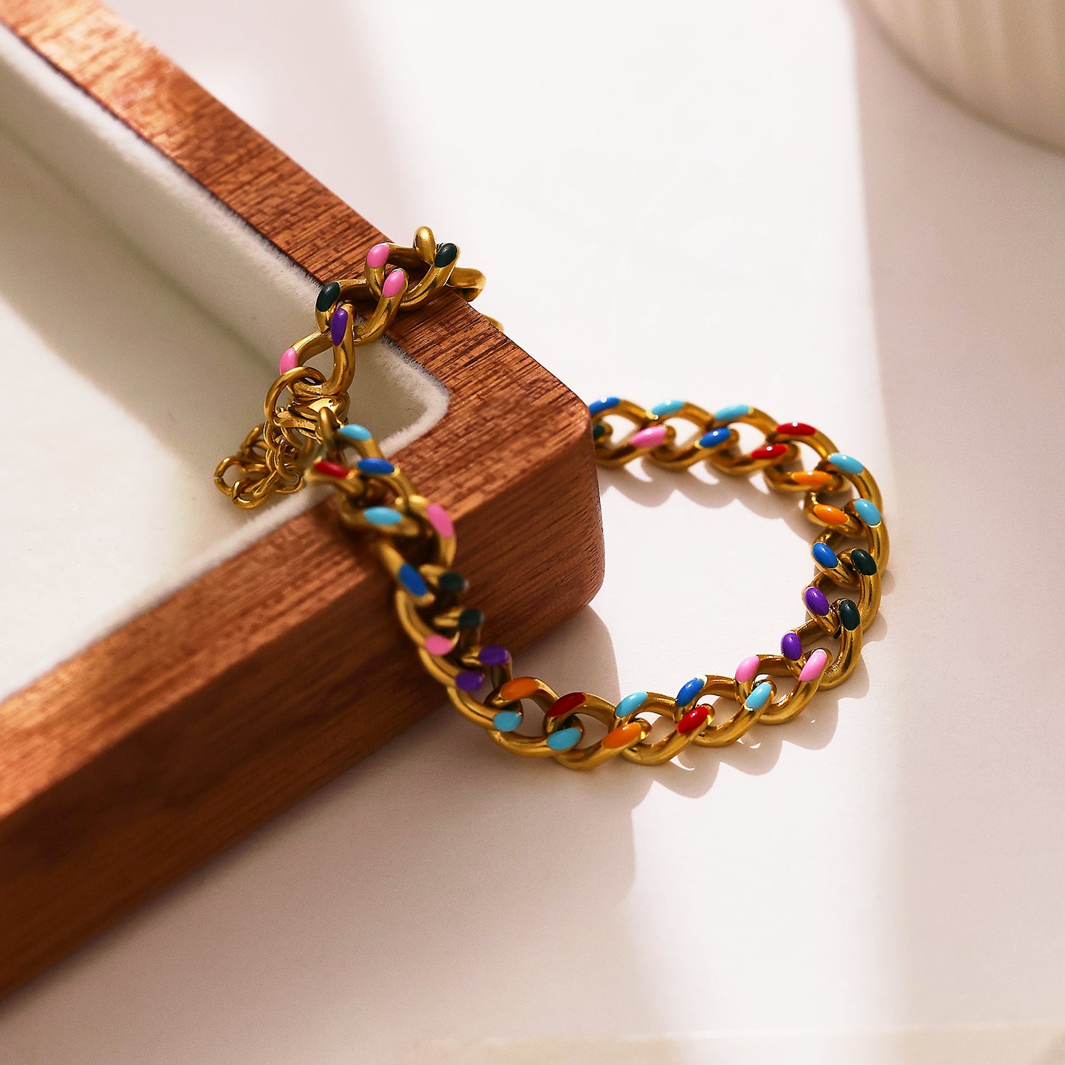 Elevate your look with this playful yet polished 18k gold-plated chain bracelet, featuring vibrant enamel links in red, blue, pink, purple, and green. The adjustable clasp ensures a perfect fit, making it an easy go-to for everyday wear or a thoughtful gift for someone special. Add a bright splash of color to any outfit with this versatile, cheerful accessory.